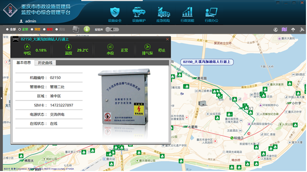 | 重慶市市政綜合管理平臺(tái)建立后,已初步對(duì)設(shè)施及下屬設(shè)備實(shí)現(xiàn)信息化管理,建立系統(tǒng)如下: 1. 下水道易燃易爆氣體監(jiān)測(cè)系統(tǒng),對(duì)383處監(jiān)控點(diǎn)進(jìn)行了甲烷濃度、液位狀態(tài)等數(shù)據(jù)實(shí)時(shí)監(jiān)測(cè); |